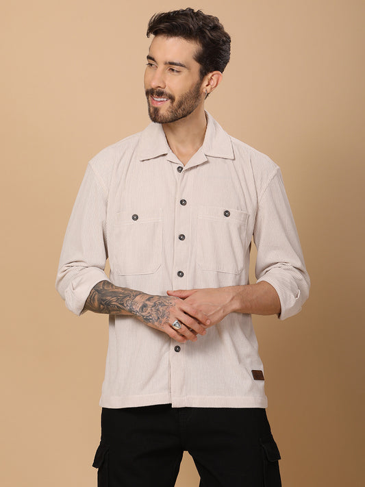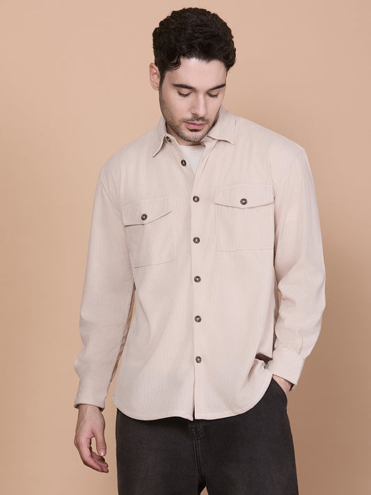 Relaxed Fit Camp Collar Corduroy Shirt with Double Pockets - Beige