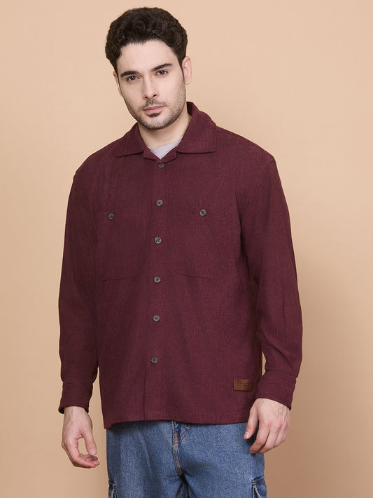 Relaxed Fit Camp Collar Corduroy Shirt with Double Pockets - Wine