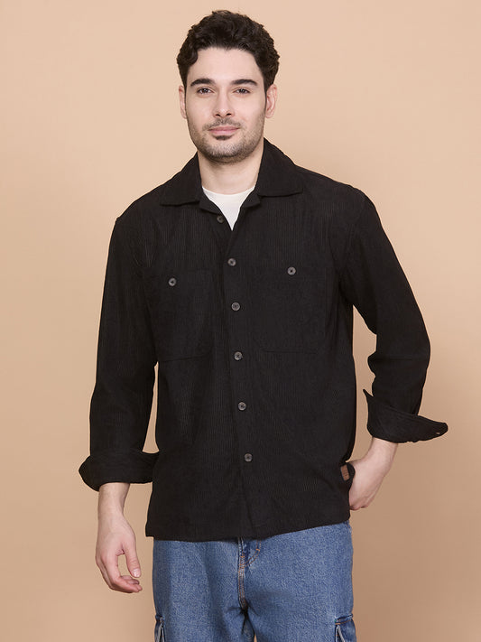 Relaxed Fit Camp Collar Corduroy Shirt with Double Pockets - Black