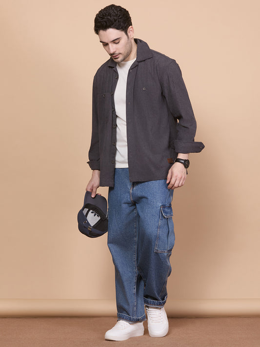 Relaxed Fit Camp Collar Corduroy Shirt with Double Pockets - Dark Grey