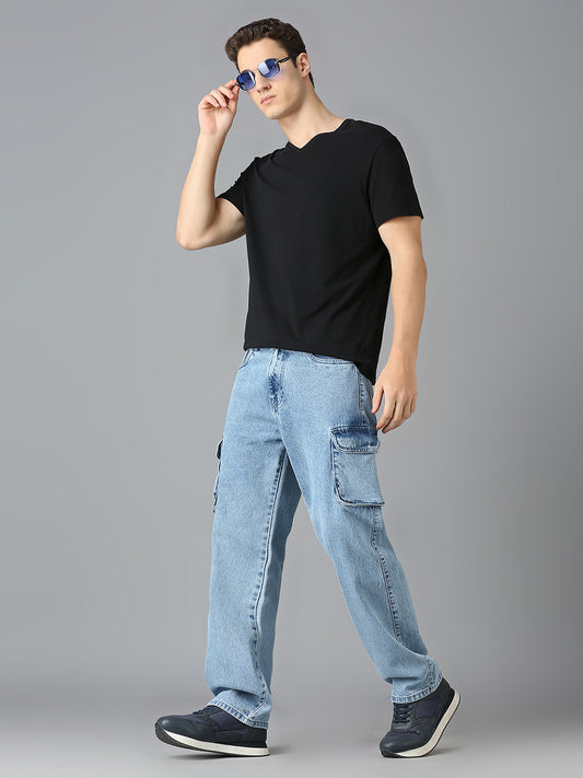 Faded Blue Multi-pocket Cargo Jeans (Men,Blue)