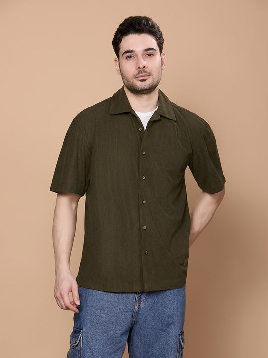 Relaxed Fit Half Sleeve Classic Corduroy Shirt - Olive