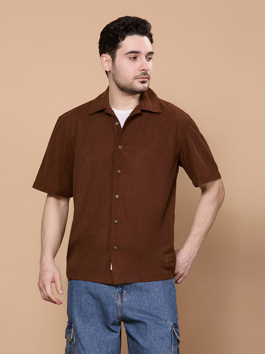 Relaxed Fit Half Sleeve Classic Corduroy Shirt - Brown