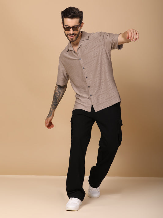 Men’s Casual Half-Sleeve Shirt – Zigzag Texture, Straight Hem, Camp Collar - Beige